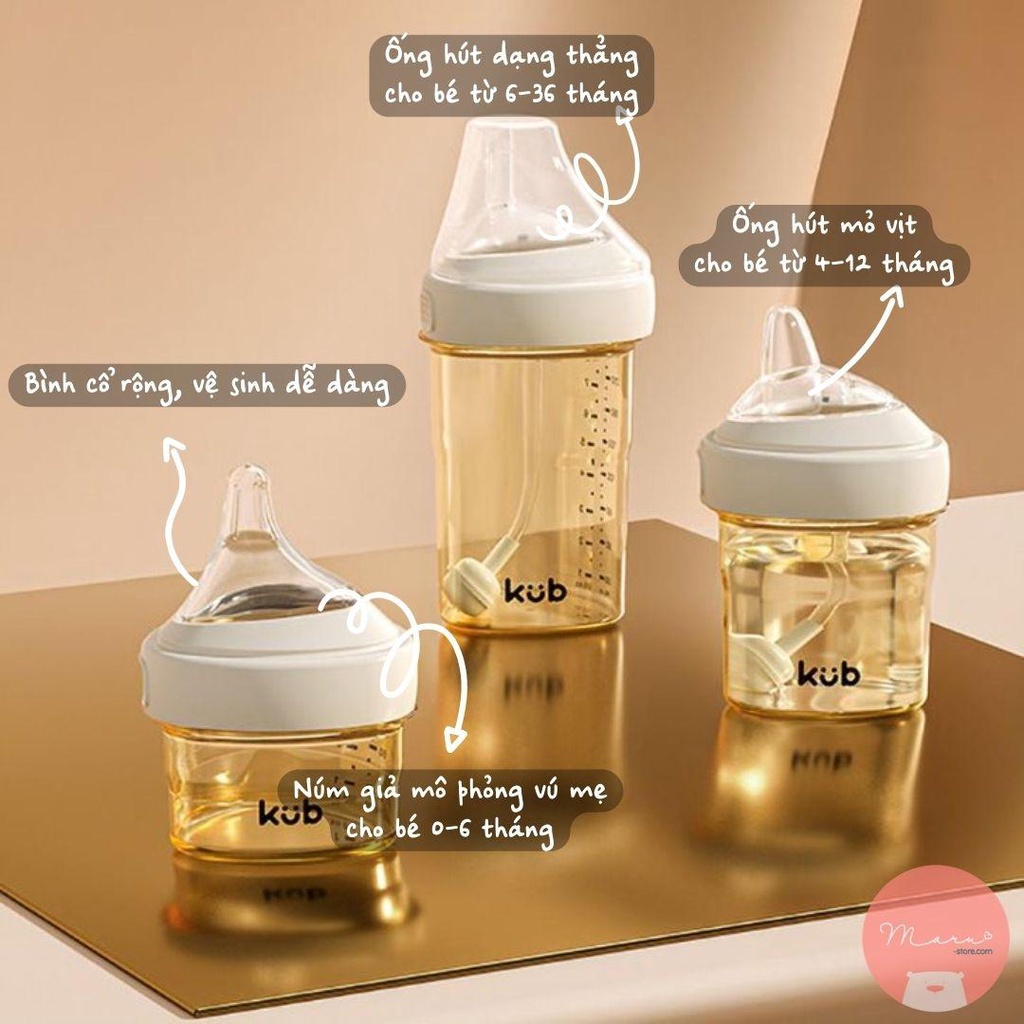 Chưa hết, giữ vững danh tiếng luôn chăm chút cho từng thiết kế sản phẩm, KUB đã cho bộ bình sữa này thiết kế núm lệch tâm giúp bé dễ dàng bú mà không lo ngước đầu, đầy hơi hay sặc sữa. Thiết kế dáng bình hình tam giác cho các bé yêu cầm nắm dễ dàng hơn cùng và chất liệu PPSU nhập khẩu từ Mỹ đảm bảo an toàn tuyệt đối cho con.