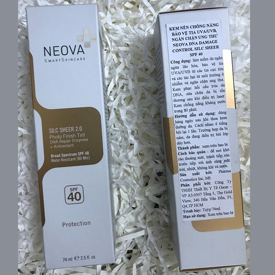 - Neova DNA Damage Control Silc Sheer 2.0 SPF40 có khả năng kháng nước trong 80 phút và giúp bảo vệ da khỏi lão hóa, đặc biệt là cháy nắng, sạm da… - Khả năng che phủ và cải thiện tone da nhờ đó cải thiện bề mặt da tinh tế hơn. - Với chất kem màu da, sản phẩm chống nắng rất lý tưởng để sử dụng như 1 lớp nền mỏng nhẹ giúp da trông mịn màng hơn. - Kem chống nắng bảo vệ da Neova SPF 40 phù hợp với hầu hết mọi loại da; kể cả làn da nhạy cảm nhất và da sau điều tr ị thẩm mỹ. - Chất kem chống nắng khi thoa lên da trông tự nhiên, cải thiện rõ khuyết điểm thường thấy ở sản phẩm chống nắng vật lý là độ trắng bệch khi thoa lên da. - Với chất kem lỏng và siêu dễ tán đều nên kem chống nắng bảo vệ da Neova SPF 40 có khả năng che phủ lỗ chân lông to, giấu đi 1 số ít khuyết điểm, cải thiện làn da mịn màng hơn. - Kem chống nắng bảo vệ da Neova SPF 40 giúp dưỡng ẩm tốt, giúp bạn cảm nhận được độ ẩm mịn nhất định của da. - Điểm cộng tiếp theo của sản phẩm là chỉ cần 5 – 10 phút thoa kem lên da, bề mặt da hoàn toàn khô thoáng, siêu mịn, không để lại cảm giác bóng nhờn. - Sản phẩm chứa công thức Oil-free (không dầu) nên da dầu nhờn, hỗn hợp đều sử dụng hiệu quả mà không lo sau nhiều giờ da trở nên xỉn màu hay đổ nhờn. - Kem chống nắng Neova SPF 40 có mùi dễ chịu, tựa như mùi kem trang điểm. - Khả năng chống chịu nước lên đến 80 phút