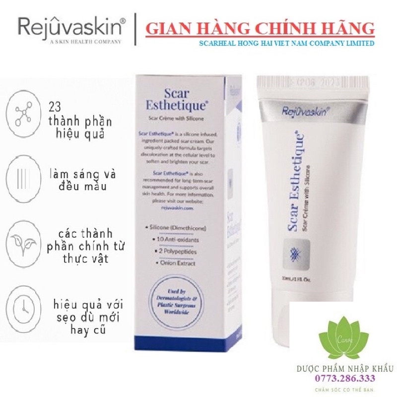 KEM SẸO SCAR ESTHETIQUE 10ml từ hãng Scar Heal Rejuvaskin Mỹ. Hỗ trợ làm mờ: sẹo lõm, sẹo rỗ, thâm, vết rạn da, sẹo do mụn, sẹo thuỷ đậu, sẹo bỏng, sẹo khâu, sẹo mất sắc tố,..v.v Cam kết hàng chính hãng, bao check trực tiếp với hãng. Tem điện tử check hàng chính hãng đầy đủ. - Có 3 lựa chọn dành cho bạn: Tuyp 10ml – 30ml và 60ml - Là dạng kem đặc nhanh khô, lành tính, ko gây kích ứng da. Chất kem màu vàng nhạt, ko thơm. Thoa lên da thấm nhanh, không gây nhờn rít bết dính. Phù hợp với cả da nhạy cảm, da dầu. Sử dụng được cho bà mẹ sau sinh mờ rạn, trẻ em., cả nam và nữ..vv 🍀Thành phần: 23 thành phần mờ sẹo và dưỡng da. Ức chế tốt sự tổng hợp hắc sắc tố, ức chế quá trình hình thành melanin, giúp làm phẳng sẹo, mờ hoàn toàn vết thâm sẹo. Hoạt chất Collagen và các dưỡng chất: Tái tạo và cung cấp năng lượng cho làn da, đặc biệt cho những làn da yếu, thiếu sức sống. 🍀Ưu điểm: • Phục hồi da tổn thương • Giúp mờ sẹo nhanh chóng • Kích thích tế bào da mới phát triển • Làm đầy sẹo rỗ một cách nhanh chóng và hiệu quả • Chống lão hóa, tăng sức đề kháng giúp trẻ hóa làn da.