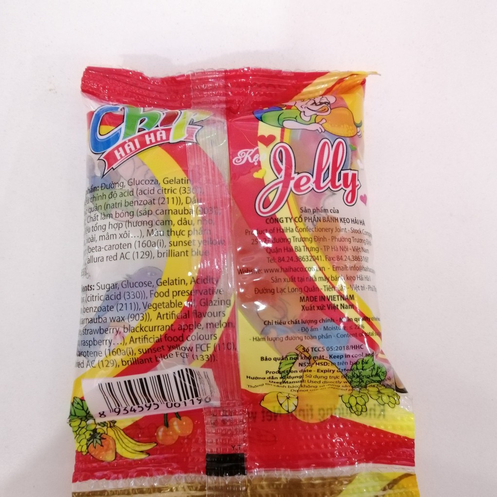 Kẹo Dẻo Chip Hải Hà - Những viên kẹo mềm dẻo, nhỏ cỡ đầu ngón tay, hình dạng các con vật khác nhau nhiều màu sắc rất ngộ nghĩnh đẹp mắt, cùng với đó là vị chua ngọt hài hoà mang lại cảm giác thích thú khi thưởng thức Thành phần: Đường, glucose, gelatin, chất điều chỉnh độ axit, chất làm bóng, hương liệu tổng hợp (hương cam, dâu, nho, táo, dưa, xoài, mâm xôi,...), màu thực phẩm tổng hợp, dầu thực vật Hướng dẫn sử dụng: Dùng trực tiếp Quy cách: Lốc 10 gói x 16g Hạn sử dụng: 12 tháng Địa chỉ kho: 28/36/1 Lương Thế Vinh Phường Tân Thới Hòa Quận Tân Phú TP. Hồ Chí Minh Khách hàng mua sỉ liên hệ 0901 656 897 để được giá tốt