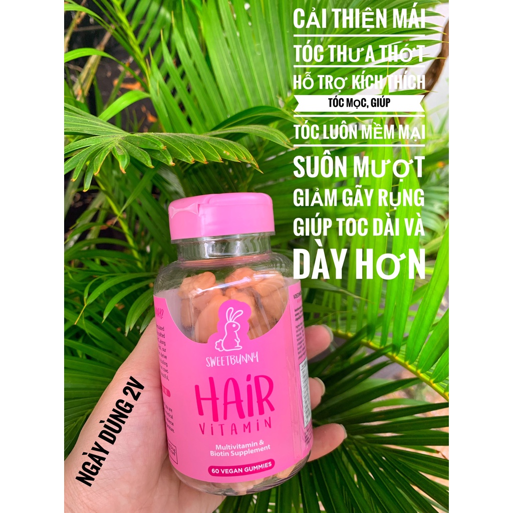 - Kẹo Thỏ Mọc Tóc SweetBunnyHare Hair Vitamin Chính Hãng Từ Mỹ giúp cung cấp 13 dưỡng chất, và vitamin thiết yếu cho tóc, giúp tóc phát triển khỏe mạnh, giúp làm tăng độ dày, tăng độ đàn hồi, làm giảm gãy rụng cho tóc. Sản phẩm kẹo dẻo thuần chay hương vị trái cây ngon, dễ nhai và hấp thu tốt, hiệu quả rõ rệt sau một thời gian sử dụng.