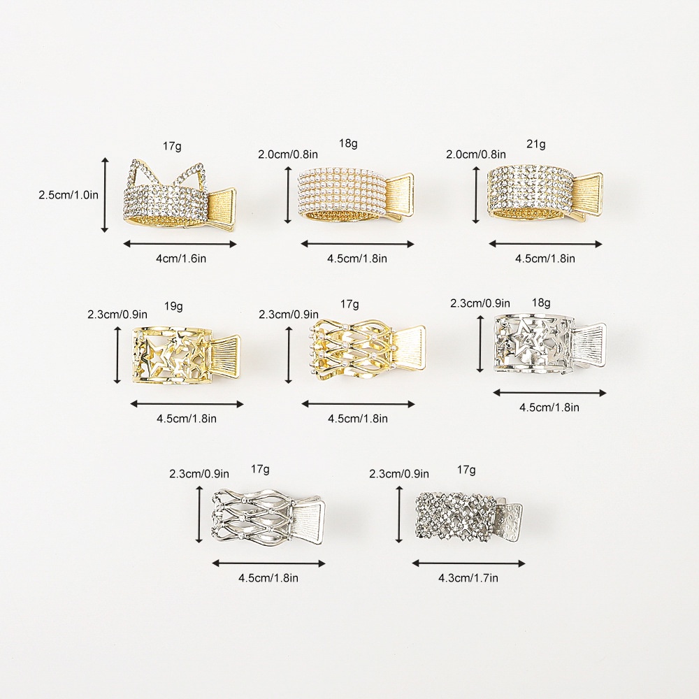 1.Thông tin chi tiết: Chất liệu: hợp kim Thể loại: Kẹp tóc Màu sắc: Vàng, Bạc Phong cách thời trang Kích thước: khoảng 4cm Thích hợp cho: Hàng ngày, mua sắm, tiệc tùng, hẹn hò, tặng quà Đặc điểm: tóc cố định, kiểu tóc đuôi ngựa cao Gói bao gồm: 1 cái * kẹp tóc