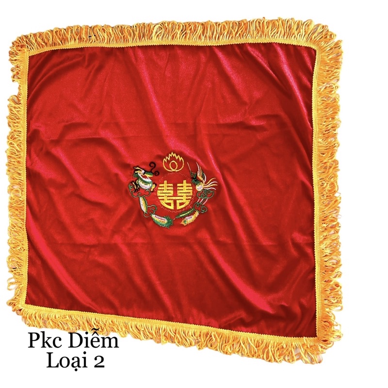 Chất liệu vải nhung viền rua vàng Có màu đỏ, màu vàng, màu hồng kích thước 60x60 tính cả tua shop có 2 hàng loại 1 và loại 2 cho khách lựa chọn Loại 1 chất nhung mềm mịn, họa tiết thêu sắc nét hơn loại 2