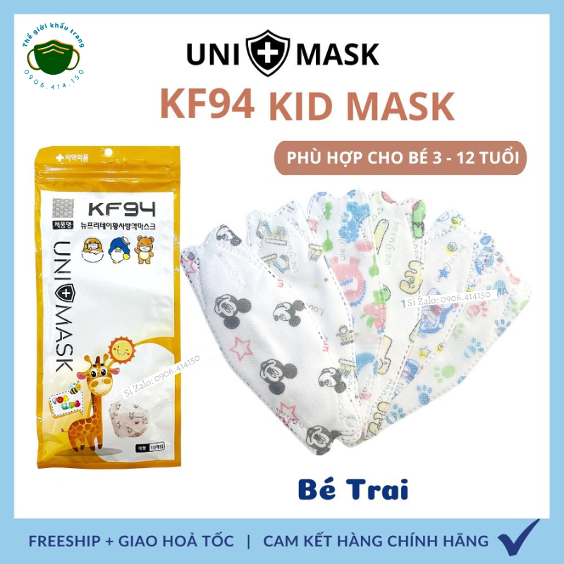 [Thùng 300 Cái] Khẩu trang trẻ em UNI MASK 4 lớp kháng khuẩn kèm nhiều hoạ tiết dễ thương Mô tả sản phẩm, thông số kỹ thuật: - Kích thước khẩu trang: 110 x 150 mm - Đóng gói: Thùng/30Túi, 1 Túi / 10 Cái -Độ tuổi phù hợp: 3-12 tuổi - Màu sắc : Trắng kèm hoạ tiết - Trọng lượng nhẹ: 50g - Chất liệu: sợi tự nhiên - Xuất xứ: Việt Nam -Ngày sản xuất: 01/03/2022 Hạn sử dụng: 01/03/2025 Hạn sử dụng: 36 tháng Số lưu hành: CP12579 Số sêri: 17859238 Tên tổ chức chịu trách nhiệm sản xuất: Công Ty TNHH & TM UNIMASK Địa chỉ tổ chức chịu trách nhiệm sản xuất: thôn Xuân Lai - xã Xuân Lai - huyện Gia 🍀 CÔNG DỤNG: • Ngăn ngừa bụi, ô nhiễm • Ngăn ngừa tia UV tiếp xúc da trẻ em • Thiết kế N95 ôm sát, hàn siêu âm dọc thoáng khí không gây cảm giác ngộp cho trẻ