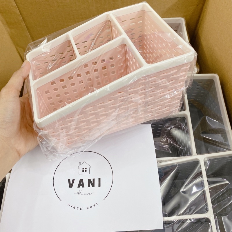 Hộp nhựa nhiều ngăn đa năng. Kích thước 19.5x14.5×9cm. Nhựa PP. Hộp có viền mau trắng, khay (rổ) đựng vật dụng, hộp được thiết kế đẹp mắt cứng cáp. Màu sắc trang nhã là phụ kiện nhà bếp hoặc trang trí đẹp mắt. Thông tin chi tiết: Được làm từ nhựa cao cấp, bền bỉ mỗi khi sử dụng. Sản phẩm này có thể lưu trữ các công cụ trang điểm, bút, điện thoại, vv Thiết kế bốn 4, giúp bạn sắp xếp các vật dụng theo thứ tự và làm cho bàn làm việc được gọn gàng.