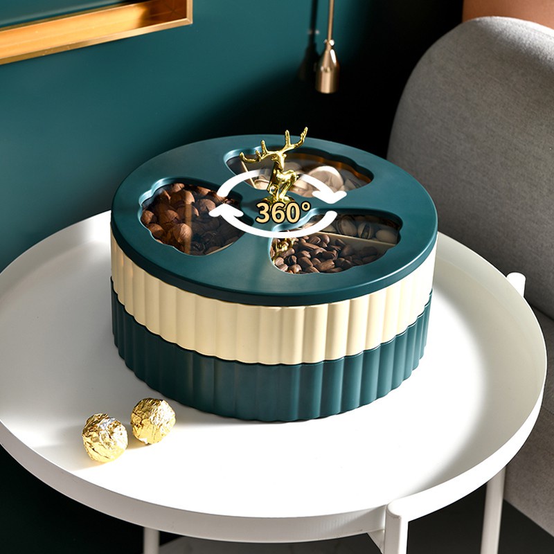 Nhà Cửa & Đời Sống > Đồ dùng nhà bếp và hộp đựng thực phẩm > Hộp, túi đựng thực phẩm > Khay đựng bánh kẹo, mứt Tết xoay 360 độ 2 tầng hình hươu vàng 6 ngăn cao cấp, sang trọng