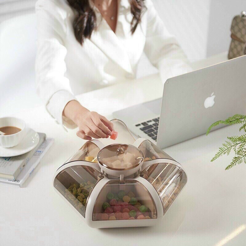 Thông Tin Sản Phẩm Khay gồm 6 hũ nhỏ tròn xinh xắn hình hoa giúp bạn bảo quản mứt bánh luôn được thơm ngon và vệ sinh. Kích thước khay to nhất 23 cm. Khay mứt tự xoay này được làm từ nhựa cao cấp rất an toàn cho người sủ dụng, không bị ám mùi nhựa lên đồ ăn và thân thiện với môi trường. Thể tích lớn có thể sử dụng đựng các loại thực phẩm; đồ ăn…như bánh; mứt; kẹo; hạt dưa… Thiết kế thông minh phần nắp hộp có 1 đầu nắp, chỉ cần ấn đầu nắm đó 6 cánh bung khay ẩn trong hộp sẽ đồng loạt mở ra, nhìn rất đẹp măt, tạo ấn tượng cho người nhìn.