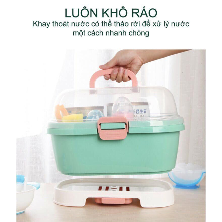 Khay Úp Bình Sữa Jupin Tiện Lợi Có Khay Đựng Nước Cao Cấp Cho Bé Riêng cái khoản bình sữa của con thì các mẹ luôn phải đảm bảo vệ sinh. Bởi vì đây là những vật dụng bé trực tiếp đưa vào miệng để sử dụng. Chính vì vậy trong nhà có con nhỏ lúc nào cũng cần để bình sữa của con được khô ráo, tránh bụi bẩn và các loại côn trùng gây bệnh ạ. - Chất liệu nhựa an toàn, dày dặn, chắc chắn - Sản phẩm nắp đậy kín giúp giữ vệ sinh cho đồ đựng bên trong. - Thiết kế tay cầm tiện lợi, mẹ có thể mang theo đến bất cứ đâu để sử dụng mà không sợ bị thất lạc đồ. - Khoang chứa đồ rộng, có thể chứa bình sữa cao tới 18cm & nhiều loại phụ kiện khác của bé như: núm ty, cắn nướu, bát, thìa ăn.... - Giá úp Bình Đa năng có các thanh úp giúp bình không bị xô lệch khi di chuyển, hơn nữa giá úp có khe rộng giúp bình mau khô và sạch sẽ hơn khi cất trữ. - Sau này khi con ăn dặm mẹ cũng thoải mái cho bát đồ dùng ăn dặm của con vào đó. - Có chỗ thoát nước phía dưới