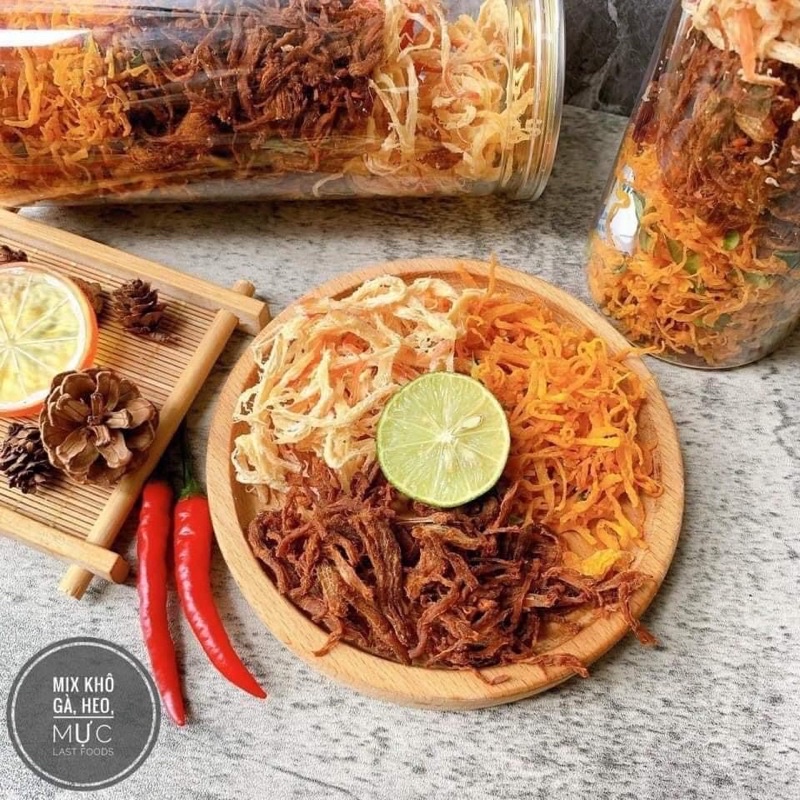 KHÔ MIX 3 VỊ: HEO - MỰC - GÀ (Thơm ngon - Đậm vị) | Hủ 300gr | ------ Bao gồm: 🐂 Khô heo cháy tỏi đậm vị thơm nức 🍀 🐂 Khô mực sợi hấp nước dừa. Với vị ngọt của mực và độ thơm của nước dừa khiến thực khách phải xuýt xoa 🐂 Khô gà lá chanh thơm ngon. ------ - Xuất xứ: Việt Nam - Đóng gói: Hủ 300 Gram (ẢNH THẬT 100%) - HDSD: Dùng trực tiếp khi mở hộp hoặc có thể nặng thêm chanh để món ăn trở nên ngon hơn. Tránh ánh nắng trực tiếp, bảo quản nơi thoáng mát