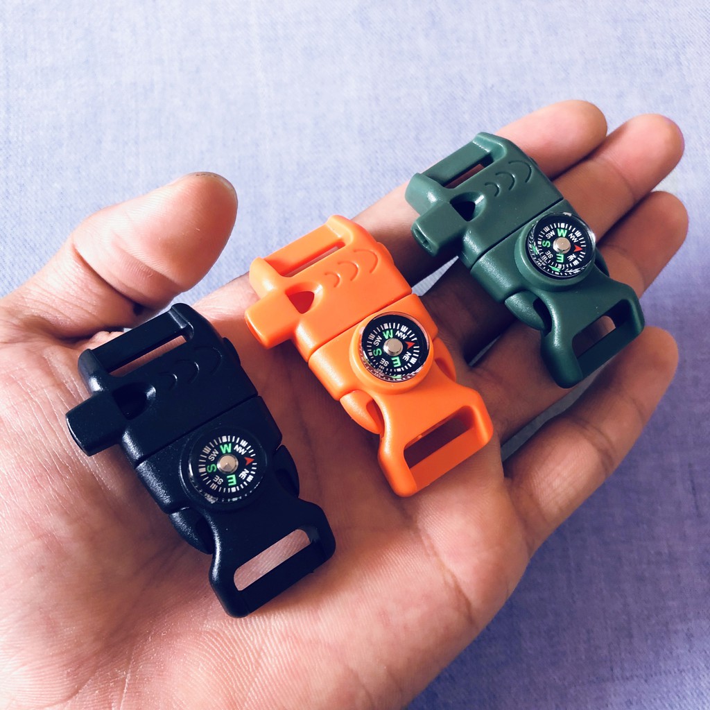 Khóa paracord có la bàn, còi, đánh lửa làm vòng tay sinh tồn - Dùng kết hợp đan vòng tay paracord, túi xách, quần áo... - Chất liệu: nhựa - Chức năng : la bàn, đánh lửa, còi - Màu sắc : cam, đen, xanh bộ đội