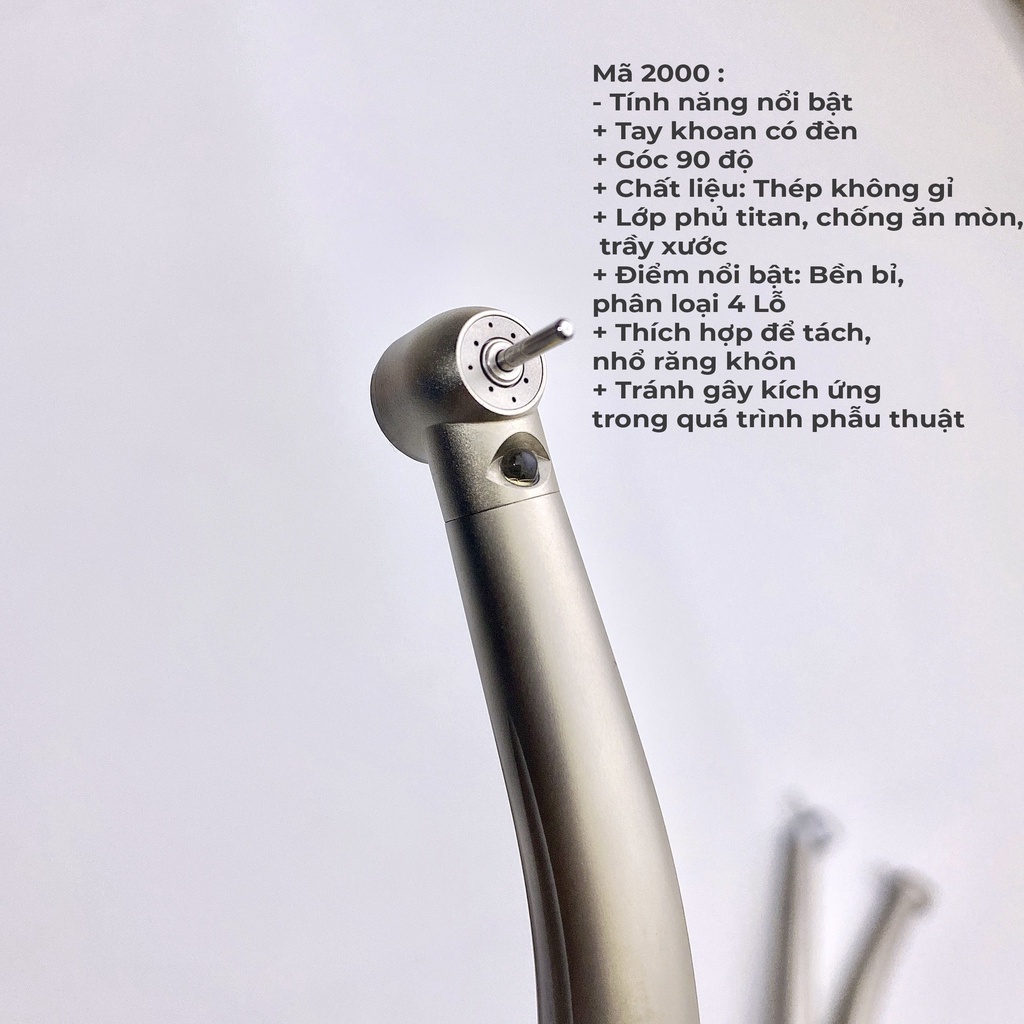 Mã 2000 - Tay khoan nha khoa Rubbi có đèn 45* - Tính năng nổi bật + Chất liệu: Thép không gỉ + Lớp phủ titan, chống ăn mòn, trầy xước + Điểm nổi bật: Bền bỉ, phân loại 4 Lỗ + Thích hợp để tách, nhổ răng khôn