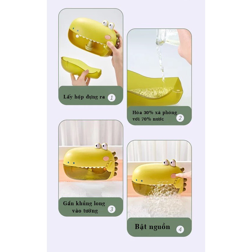 Đặc điểm - Với thiết kế mẫu khủng long đáng yêu, màu sắc bắt mắt đảm bảo các bé sẽ cực kỳ thích - Chất liệu được lựa chọn cẩn thận đảm bảo sản phẩm dẻo dai, chống mài mòn , độ bền cao - Khủng long tạo bọt chạy bằng pin và có kèm theo nhạc ( âm thanh chuẩn, trung thực) - Với thiết kế bám dính phía sau có thể gắp lên các bề mặt phẳng như tường nhà tắm hay chậu tắm , không cần khoan đục tương - Khủng long tạo bọt được thiết kế đường nét bo tròn các cạnh nên tuyệt đối an toàn cho bé - Phía khoang chứa pin có roăng cao su đảm bảo chống nước - Với thiết kế đầu vòi tạo bọt có thể thu ngắn, kéo dài phù hợp cho các mức nước bên trong miệng con khủng long - kích thước: 15,5x22cm - Màu sắc : Đỏ và Vàng chanh - Sản Phẩm có hộp của nhà sản xuất Các Dùng : - Bố mẹ chỉ cần lắp pin vào và vặn chặt nắp đậy pin phía sau. - Tháo khoang chứa ở miệng khủng long và hòa 30% xà phòng với 70% nước rồi lắp vào. - Gắn khủng long vào vị trí mong muốn - Bật nút nguồn và bọt sẽ được tạo ra.