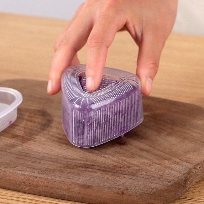 Hướng dẫn sử dụng : Tráng qua khuôn với nước. Cho cơm vào khuôn, đậy nắp lại, nén chặt. Mở nắp, lật úp khuôn, ấn vào giữa đáy khuôn để lấy cơm ra. Trang trí theo ý thích. Có thể trộn cơm với gia vị rắc cơm, quấn rong biển, hoặc cho nhân tùy thích vào giữa… Vệ sinh sạch sẽ sau khi dùng. Không dùng trong máy rửa chén. BQ nơi thoáng mát. Tránh gần lửa. Chúc ba mẹ tìm được khuôn làm cơm nắm bento thích hợp nhất cho bé yêu!