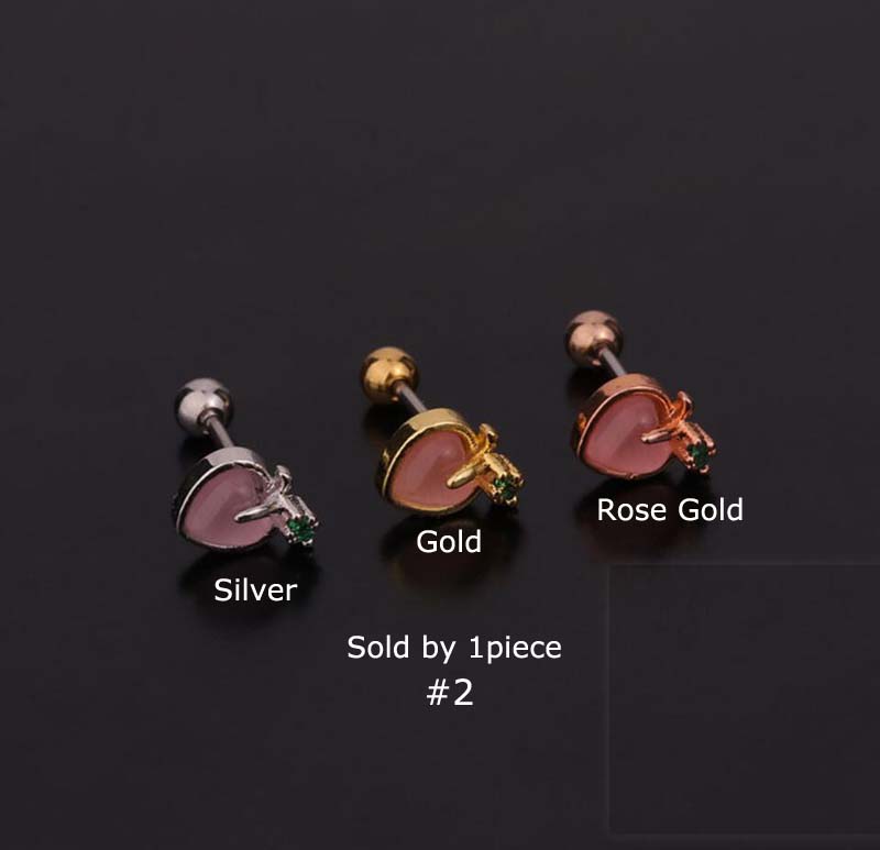 Tất cả thanh xỏ tai và hạt bằng chất liệu thép không gỉ Mặt trên của sản phẩm là chất liệu đồng và zircon Chiều dài thanh xỏ: 6mm Độ dày (trọng lượng): 0.8mm (20G) Số lượng: 1 #earrings #stainlesssteel #upperlobe #helixpiercing #pinnapiercing #traguspiercing # 20G #fruitshape