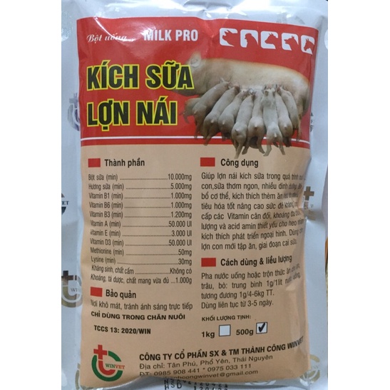 KÍCH SỮA HEO NÁI 500gr THÀNH PHẦN: Bột sữa, hương sữa, vitamin B1, B6, B3, Vitamin A, D3, E, Methioline, Lysin. CÔNG DỤNG: Giúp cho heo nái nhanh chóng có sữa và đủ sữa cho đàn con tu ti. Giúp sữa thơm ngon đậm đặc cho đàn con phát triển khoẻ mạnh. Có tác dụng như sữa heo mẹ, Kích thích thèm ăn, heo ăn nhiều tiêu hóa tốt, nâng cao sức đề kháng. Cung cấp các Vitamin, acid amin, khoáng cân đối cho vật nuôi nhằm kích thích ngoại hình. CÁCH DÙNG: trộn thức ăn hoặc nước uống hàng ngày cho lợn/ heo mẹ. Mùi vị thơm ngon kích thích khả năng thèm ăn của heo/ lợn mẹ.
