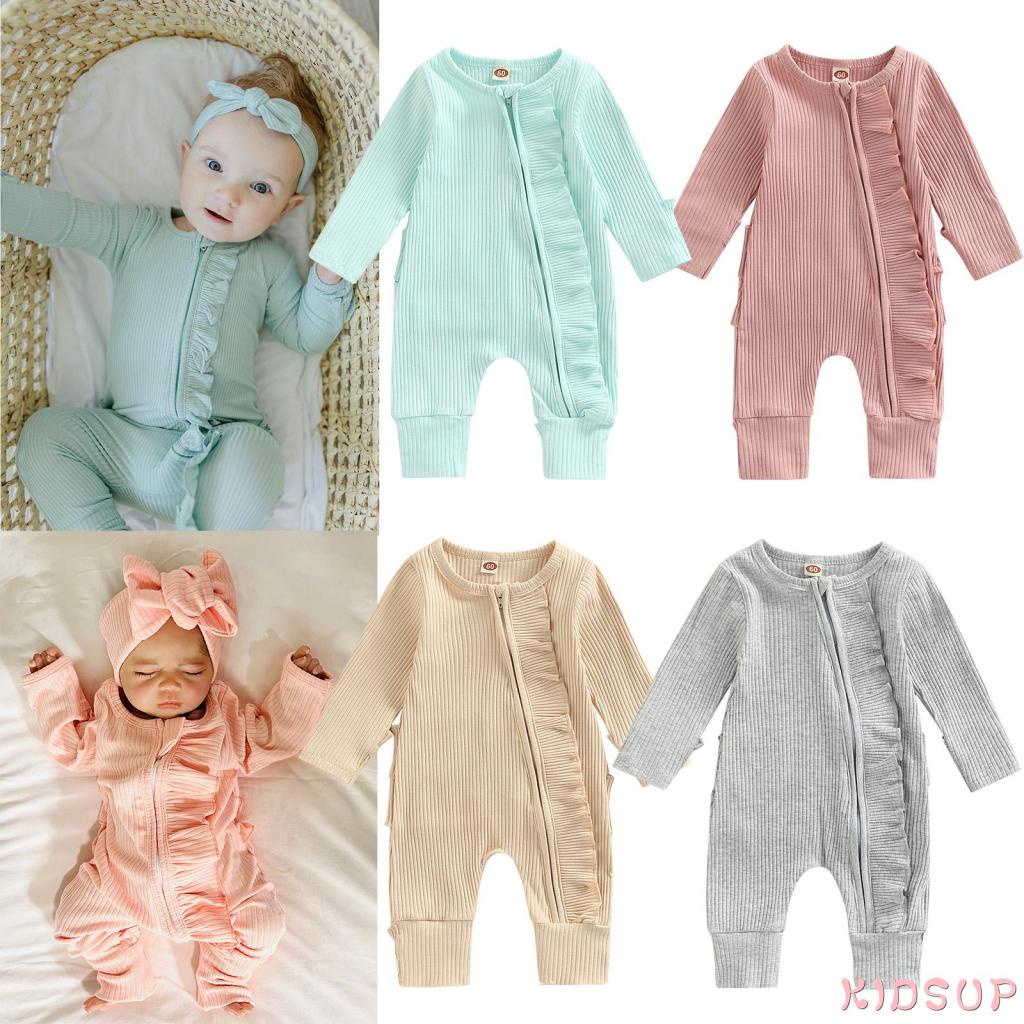 Trẻ sơ sinh Bé gái Bé trai Romper Màu đồng nhất Gân cổ tròn Dài tay Áo liền quần Ruffles Xiên Dây kéo Quần áo một mảnh