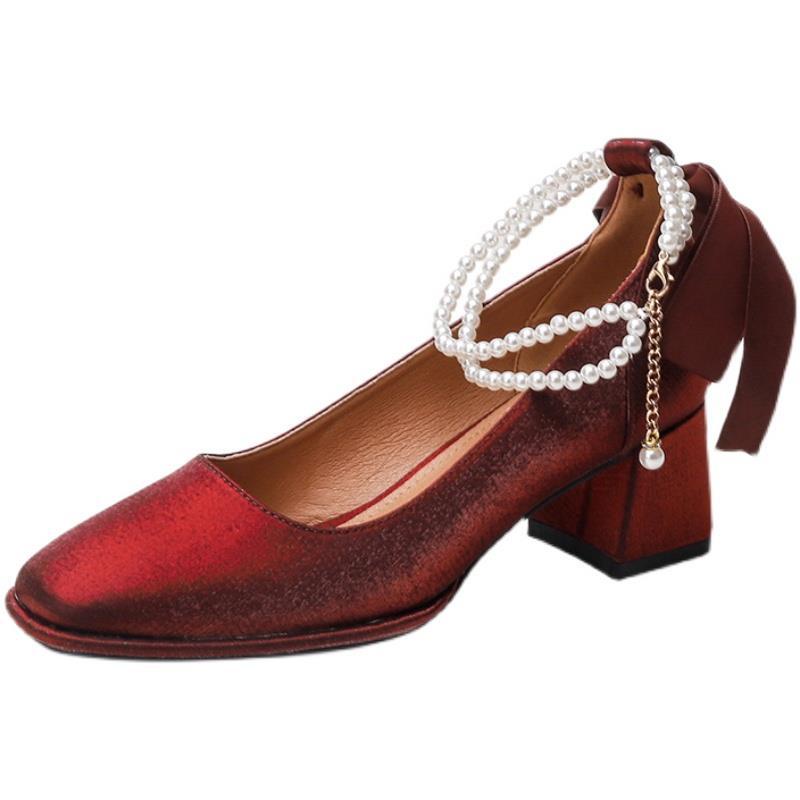 Giới thiệu 【Kiểm định chất lượng】Giày Cao Gót Mũi Vuông Đế Dày Đính Ngọc Trai Phong Cách Mới Cho Cô Dâu