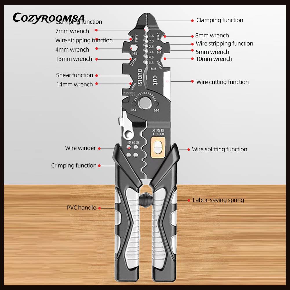 Kìm tuốt dây cáp Kìm tuốt dây cáp đa chức năng Kìm tuốt dây sắc bén Kìm uốn cong Dụng cụ thợ điện cầm tay Tính năng ' 1. Chức năng đa năng - Máy tuốt dây được thiết kế để đáp ứng nhiều nhu cầu khác nhau , từ việc tước các kích thước dây khác nhau đến uốn và cắt dây . 2. Nhỏ gọn và nhẹ - Những dụng cụ tuốt dây cáp này nhỏ và di động , giúp chúng dễ dàng mang theo và cất giữ trong hộp dụng cụ hoặc túi xách của bạn . 3. Thiết kế tiện dụng - Bộ rút dây được thiết kế công thái học để vừa vặn thoải mái trong tay bạn , cho phép sử dụng lâu dài mà không gây khó chịu hoặc mệt mỏi . 4. Lưỡi dao sắc bén - Kìm uốn có lưỡi dao sắc bén giúp tuốt dây nhanh hơn và dễ dàng hơn , giúp bạn tiết kiệm thời gian và công sức . 5. Vật liệu chất lượng cao - Những chiếc kìm cắt dây này được làm bằng vật liệu chất lượng cao và được thiết kế với độ chính xác , đảm bảo độ bền và độ tin cậy trong quá trình sử dụng .