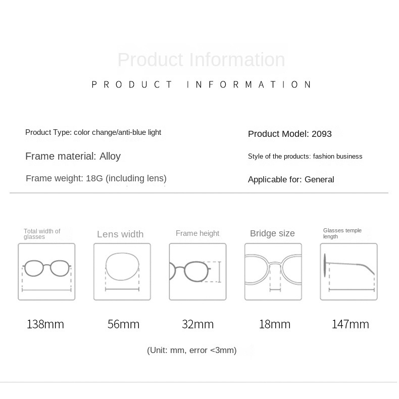 Chào mừng bạn đến ❤❤ Shopee MALL, một cửa hàng quang học hoạt động của nhà máy. Tôi Chúng tôi cung cấp các thiết kế thời trang nhất với giá cả phải chăng và hợp lý. Thấu kính quang sắc tự động thích ứng với môi trường của bạn, sạm màu khi tiếp xúc với ánh sáng mặt trời Cung cấp khả năng bảo vệ UV400 và khi bạn quay trở lại trong nhà, nó quay trở lại rõ ràng hoặc hoa anh đào. Tất cả những điều này trong khi cung cấp cho bạn khả năng bảo vệ ánh sáng xanh cho màn hình kỹ thuật số của mình. Tính chất ống kính: UV400 / chống bức xạ / ảnh Chất liệu khung: Kim loại • Giới tính: Phụ nữ / Nam giới • Dành cho: Người lớn ☛ Kích thước kính: Tổng chiều rộng khung (mm): 138 Chiều rộng ống kính (mm): 56 Chiều cao ống kính (mm): 32 Chiều rộng mũi (mm): 18 Chiều dài đền (mm): 147 Nhận xét: Xin vui lòng cho phép 0,3-0,8 cm lỗi do đo lường thủ công. Mong các bạn thông cảm! Thông tin chi tiết sản phẩm: Kính x 1 ✅2 trong 1 = Photochromic + Khối ánh sáng xanh 2 trong 1✅ ☀Nội dung gói: 1PCS kính ✅ Được bọc bằng màng bọc bong bóng để đảm bảo an toàn và hư hỏng trong quá trình vận chuyển. Nếu bạn có bất kỳ câu hỏi nào, vui lòng tham khảo ý kiến dịch vụ khách hàng trước khi đặt hàng. Chúng tôi là một cửa hàng bán hàng trực tiếp cho kính. Thường là 24 giờ vận chuyển ✅ Tất cả sản phẩm đều có hàng 🚚 Vận chuyển: 5-15 ngày làm việc, chúng tôi là mắt Cửa hàng trực tiếp gương.
