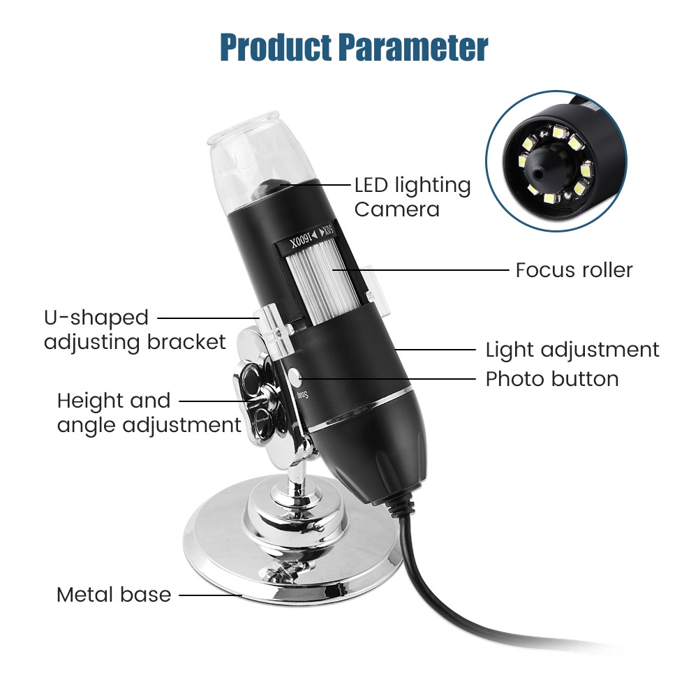Chào mừng đến với Salorie store Xin lưu ý: Sản phẩm này chỉ có thể hỗ trợ Android, không hỗ trợ IOS Tên sản phẩm: Kính hiển vi kỹ thuật số HD Đặc điểm: 1. Độ phân giải cao 2. Tám đèn LED 3. Chụp ảnh và quay video 4. 360° Xoay đế Hỗ trợ ngang, dọc, lên và xuống 360 ° Toàn trường nhìn, không có góc chết quan sát, đáy có tác dụng chống trượt 5.Cổng USB Hoạt động đơn giản, với hai bộ điều hợp, có thể được sử dụng bởi cả máy tính và điện thoại di động. 6. Điều chỉnh tiêu điểm Hoạt động lấy nét bánh xe cuộn thuận tiện hơn. 7.Giá đỡ điều chỉnh hình chữ U 8.1600x