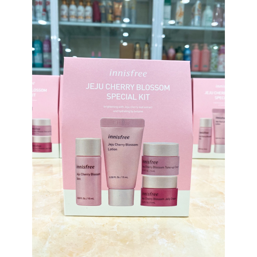 - Bộ Kit Innisfree Jeju Cherry Blossom là bộ sản phẩm chăm sóc da được chiết xuất chính từ lá Hoa Anh Đào hoàng gia kết hợp cùng dưỡng chất Betaine từ củ cải đường, Niacinamide. Set Mini Innisfree Jeju Cherry Blossom giúp dưỡng ẩm cho da, nâng tông da sáng, ngăn chặn oxy hóa và tăng khả năng đàn hồi giúp da trở nên săn chắc và đầy sức sống.