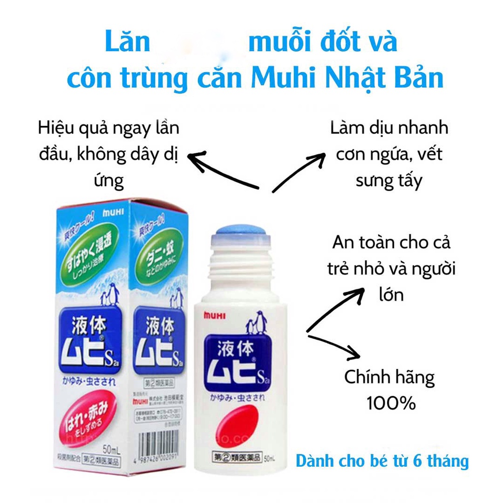 - Xuất xứ: Nhật Bản - Dung tích: 50ml không gây dị ứng, hiệu quả ngay lần đầu sử dụng. Kem làm xẹp, dịu nhanh chóng cơn ngứa, vết sưng tấy do muỗi và các loại côn trùng đốt tức thì bằng cảm giác mát lạnh khi lăn lên vết cắn không để lại sẹo. An toàn cho trẻ nhỏ và cả người lớn. -Cách dùng: Lăn trực tiếp đầu lăn lên vết cắn, đốt trên da, có thể dùng lại sau 2 tiếng, dùng được cho bé từ 6 tháng tuổi trở lên. -Lưu ý: Để xa tầm tay trẻ nhỏ.Bảo quản ở nơi khô ráo,thoáng mát. Không được để gần lửa. Trong trường hợp vào mắt trẻ thì phải rửa ngay lập tức.Nếu sau đó vẫn thấy chảy nước mắt thì phải đưa ngay trẻ đến khám tại các cơ sở y tế. #lanmuoimuhi, #chongmuoi, #chongmuoihieuqua, #muoidot, #lanmuoinhatban, #contrungcan