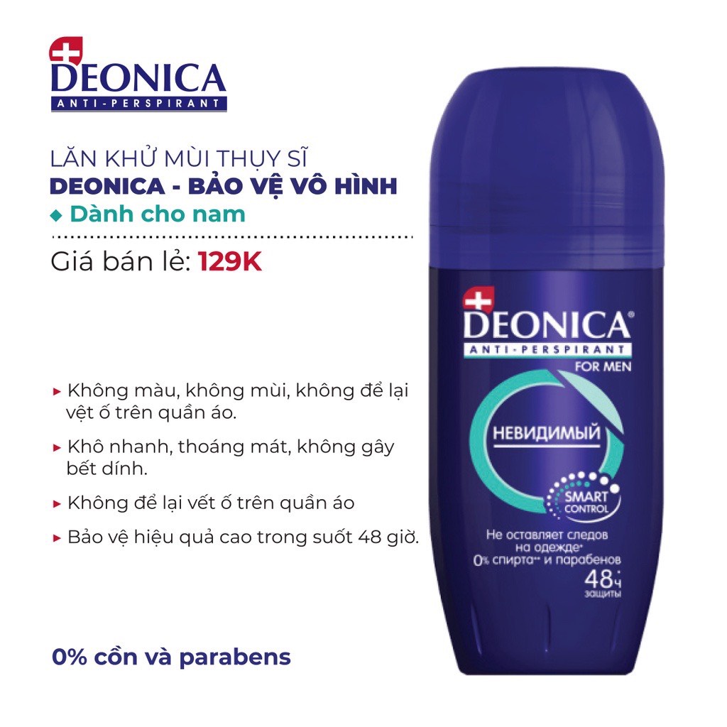 - Lăn khử mùi DEONICA KHÁNG KHUẨN dành cho nam giới loại bỏ chính nguyên nhân gây ra mùi hôi - vi khuẩn, không để lại vết ố trên quần áo trắng, đen hoặc quần áo màu và đảm bảo ngăn mùi và mồ hôi trong 48 giờ.