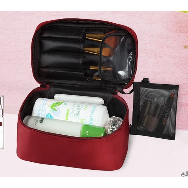 Product name: Portable cosmetic bag Fit for: home storage, travel storage Product category: cosmetic bag Color: wine red, outer black + inner black, outer black + inner red, extra large black + inner red, extra large black + inner black Use for: CDs, cosmetics, underwear, toiletries, candy, bras, tampons, postcards, medicine Function: store cosmetic products, toiletries Material: nylon Suit for: bedroom storage, travel storage, makeup storage Shape: box block Size: standard 20 length * 12 width * 10 height, extra large size: 23 length * 13 width * 13 height