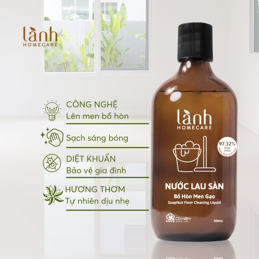 Nước lau sàn Lành: Nguyên liệu lên men bồ hòn men gạo, an toàn da tay, không hóa chất bay hơi độc hại, an toàn cho bé tập bò, chơi dưới sàn nhà Ít bọt, bốc hơi nhanh, tiết kiệm thời gian lau lại với nước, không gây nhớt, tránh trơn trượt Làm sạch các vết bẩn nhanh chóng Dung dịch đậm đặc gấp 4 lần nước lau sàn thường, tiết kiệm khi sử dụng Bảo vệ môi trường, không tắc cống, không hại môi trường khi xả thải.