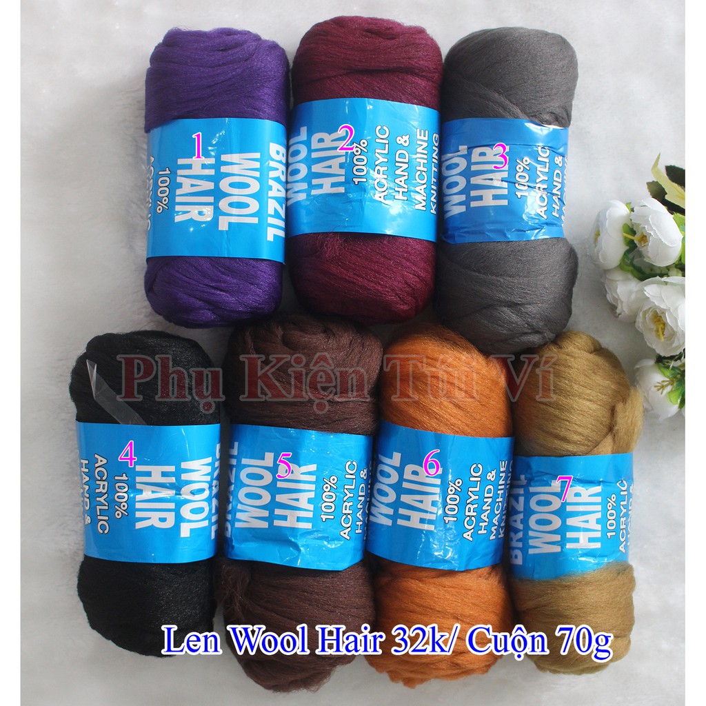 Len wool hair 32k/ cuộn 70g Khối lượng : 70g Chiều dài : 25m Chất liệu : Acrylic Dùng làm tóc cho búp bê, tóc giả trang trí sản phẩm len sợi handmade có 7 màu , khách mua sỉ ib shop được giá tốt nhé Chú ý: Một số màu tone sẽ khác với tone hình do khác đợt hàng