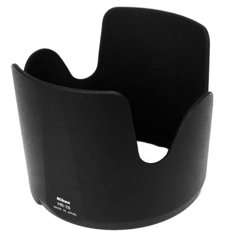 Giới thiệu sản phẩm Lens hood Nikon HB-29 (Đen). Công dụng của Lens Hood:.- Giúp ngăn không cho ánh sáng từ 2 bên chiếu vào những thấu kính.ngoài cùng. Nếu không ngăn ánh sáng từ những nguồn này, ảnh sẽ bị.vết mờ (flare) và giảm độ tương phản (contrast). Khi sử dụng loa.che nắng, ảnh sẽ cho màu sắc thực hơn (richer color) và có độ sâu.hơn (deeper saturation)..- Bảo vệ ống kính, ngăn ngừa các vết tay và tránh va đập có thể gây.vỡ ống kính. Với loa che nắng được gắn vào, những va chạm trên thấu.kính từ phía trước sẽ được hạn chế, và lực tác động cũng được giảm.bớt. Tuy nhiên, đối với các ống kính góc siêu rộng, loa che nắng.thường ngắn và tác dụng bảo vệ cũng thấp hơn..Máy.Ảnh