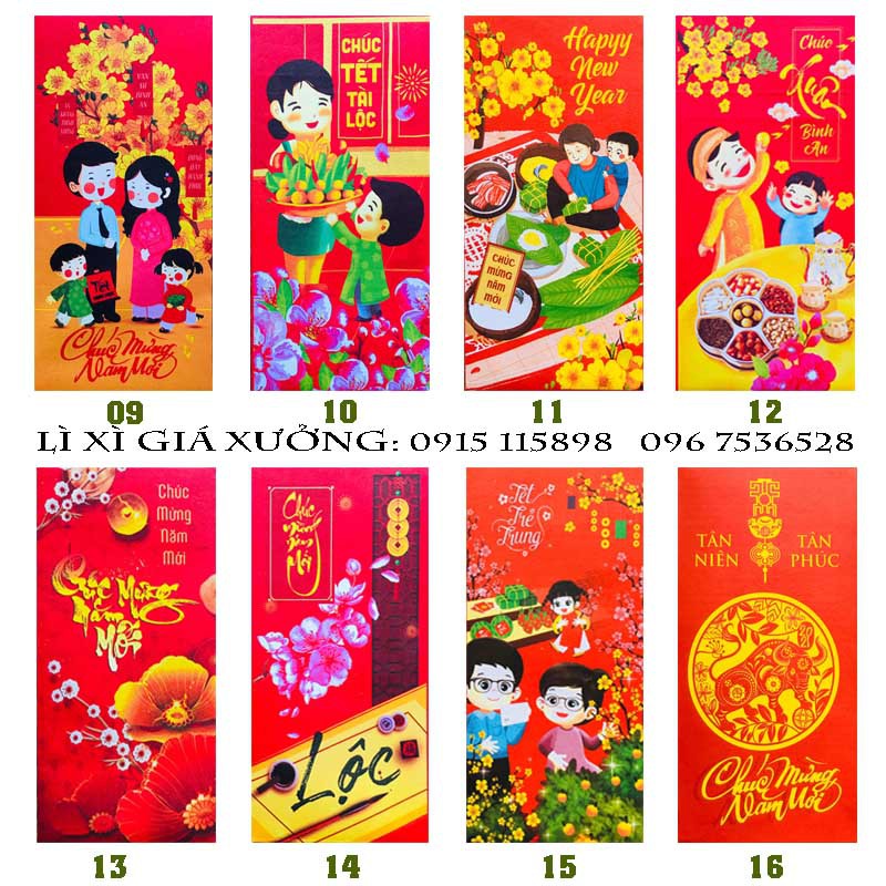 Lì xì tết giá sỉ, lì xì nhiều mẫu đẹp nhất thị trường, ảnh thật Đóng gói: 5 bao / túi *** Phân loại màu là 5 cái cùng màu, cùng 1 mẫu ++ Trộn màu mẫu là mix màu và mẫu ngẫu nhiên ++ Trộn đơn đỏ là mix mẫu màu đỏ ngẫu nhiên ++ Trộn đơn màu - note: mix mẫu ngẫu nhiên thèo 1 màu các bạn chọn, vui lòng note màu giúp shop vào phần ghi chú đơn hàng, vì inbox, shop có thể miss ạ. Xin cám ơn !