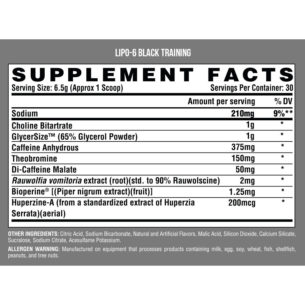 🎯 THÀNH PHẦN SẢN PHẨM NUTREX LIPO6 BLACK TRAINING: Mỗi khẩu phần Nutrex Lipo6 Black Training 30ser (tương đương 6.5g) chứa: - Cholin Bitartrate: Choline có vai trò quan trọng trong cấu trúc tế bào, hỗ trợ vận chuyển và chuyển hóa chất béo cũng như tổng hợp DNA và duy trì hệ thần kinh, giúp cải thiện các chức năng của não như trí nhớ và khả năng tập trung. - Glycerol: Thúc đẩy ngăn ngừa mất nước, cải thiện hiệu suất tập thể dục và tăng bơm cơ. - Caffeine khan: Cải thiện sự trao đổi chất và chức năng nhận thức, ức chế sự thèm ăn, tăng năng lượng. - Theobromine Anhydrous: Hợp chất được tìm thấy trong cây ca cao và lá trà có đặc tính kích thích và tăng cường năng lượng, ngăn chặn sự thèm ăn . - Rauwolfia Vomitoria: Có đặc tính sinh nhiệt trong quá trình đốt mỡ.