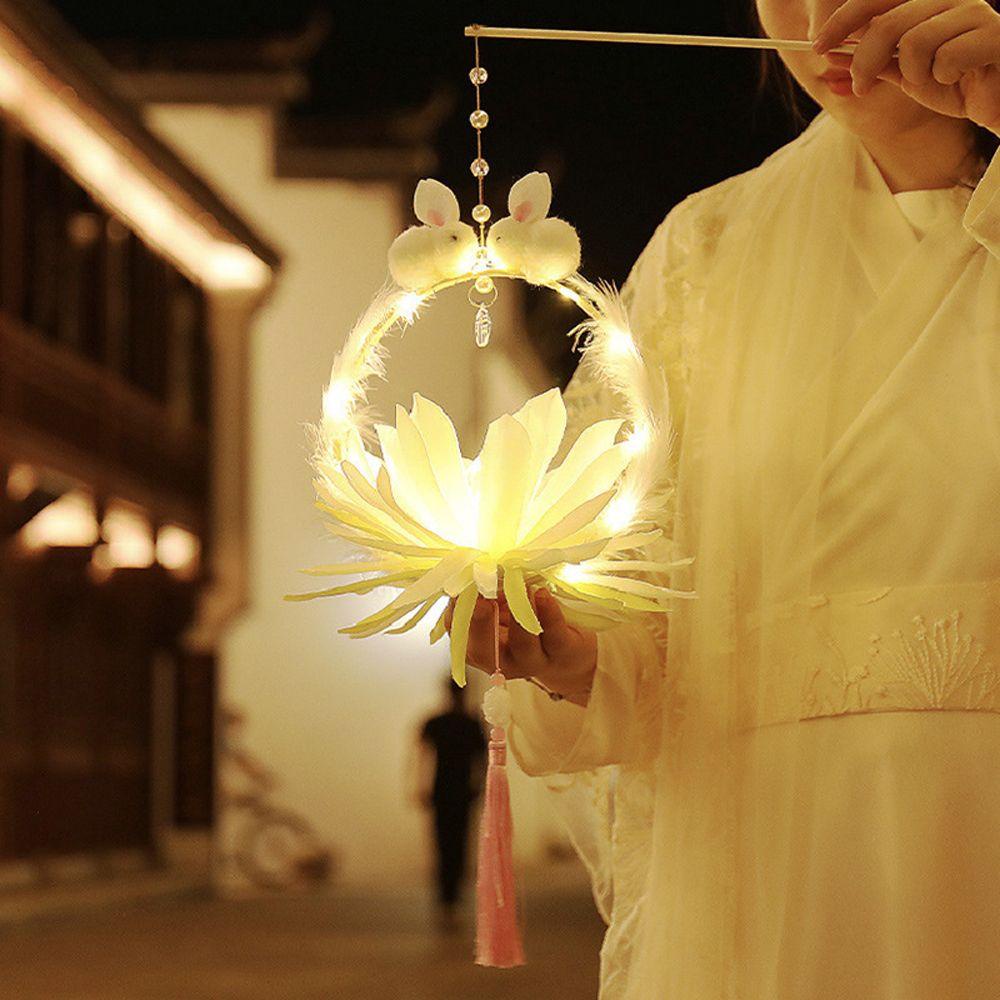 Gói bao gồm 1 bộ đèn lồng Lễ hội Trung thu Đèn lồng Phong cách Trung Quốc Ánh sáng ngày lễ Lông vũ Mặt dây chuyền hoa sen Thỏ tre Treo thủ công Cổ xưa Di động Làm sáng Thời trang