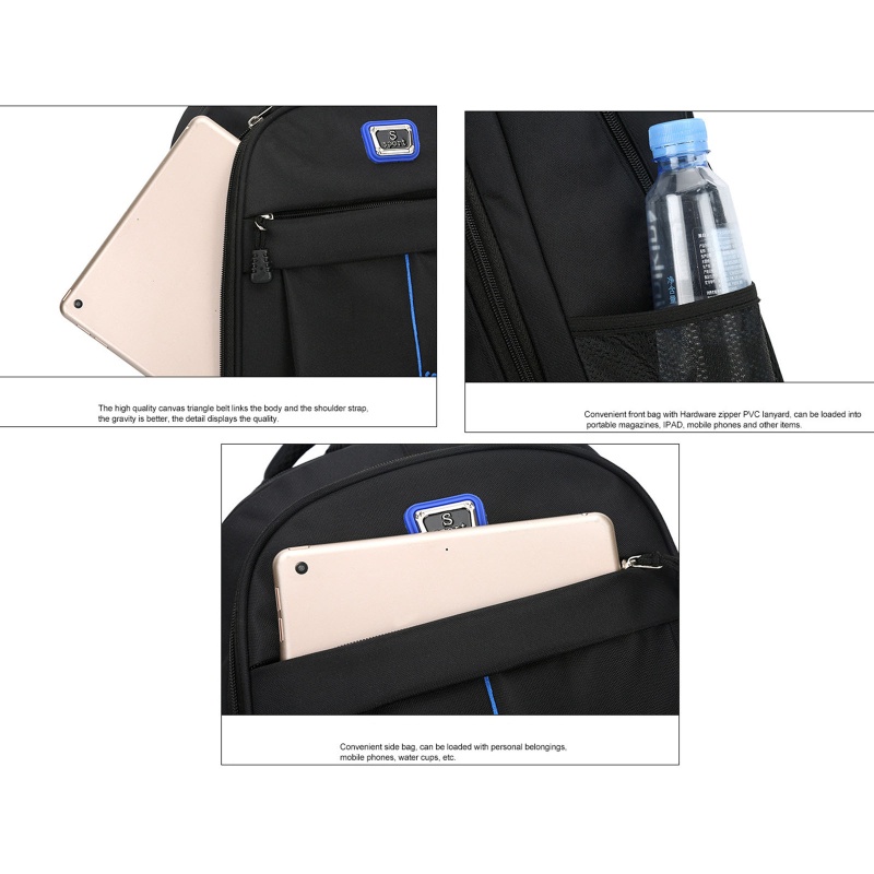 Phụ nữ Ba lô Thời trang Túi du lịch ngoài trời Nam Doanh nhân Túi máy tính xách tay thông thường Túi đi học Daypack Thương hiệu mới và chất lượng cao Tính năng ' Sức chứa lớn : Nhiều túi của ba lô đi học được thiết kế để chứa sách , quần áo , chai lọ , máy tính xách tay và các vật dụng cá nhân khác . Thực tế : Dây đeo lưng và vai được thiết kế công thái học của ba lô được làm bằng vật liệu thông gió , có thể giảm va đập va chạm một cách hiệu quả và giúp giảm tải . Dây đeo vai - Các dây đai có thể được điều chỉnh để mang theo thuận tiện hơn . An toàn khi sử dụng - Ba lô đi học cho bé trai được làm từ chất liệu nylon chất lượng , nhẹ và thoải mái khi mang theo . Ứng dụng " Hoàn toàn phù hợp để đi du lịch , đi công tác , trường học , phòng tập thể dục , leo núi , đi bộ đường dài hoặc cuộc sống hàng ngày .
