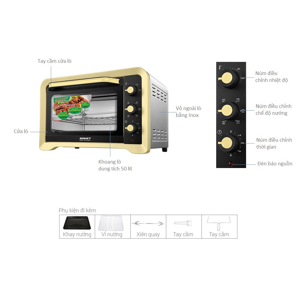 Model: VH-509N2D Dung tích: 50 lít Thương hiệu: Sanaky Công suất: 2000W Điện áp: 220V/50Hz Màu sắc: vàng bạch kim Kích thước: 564 x 415 x 363 (mm) Trọng lượng tủ: 9.7 Kg Phụ kiện kèm theo: Khay, vỉ nướng, xiên nướng, 2 tay cầm.