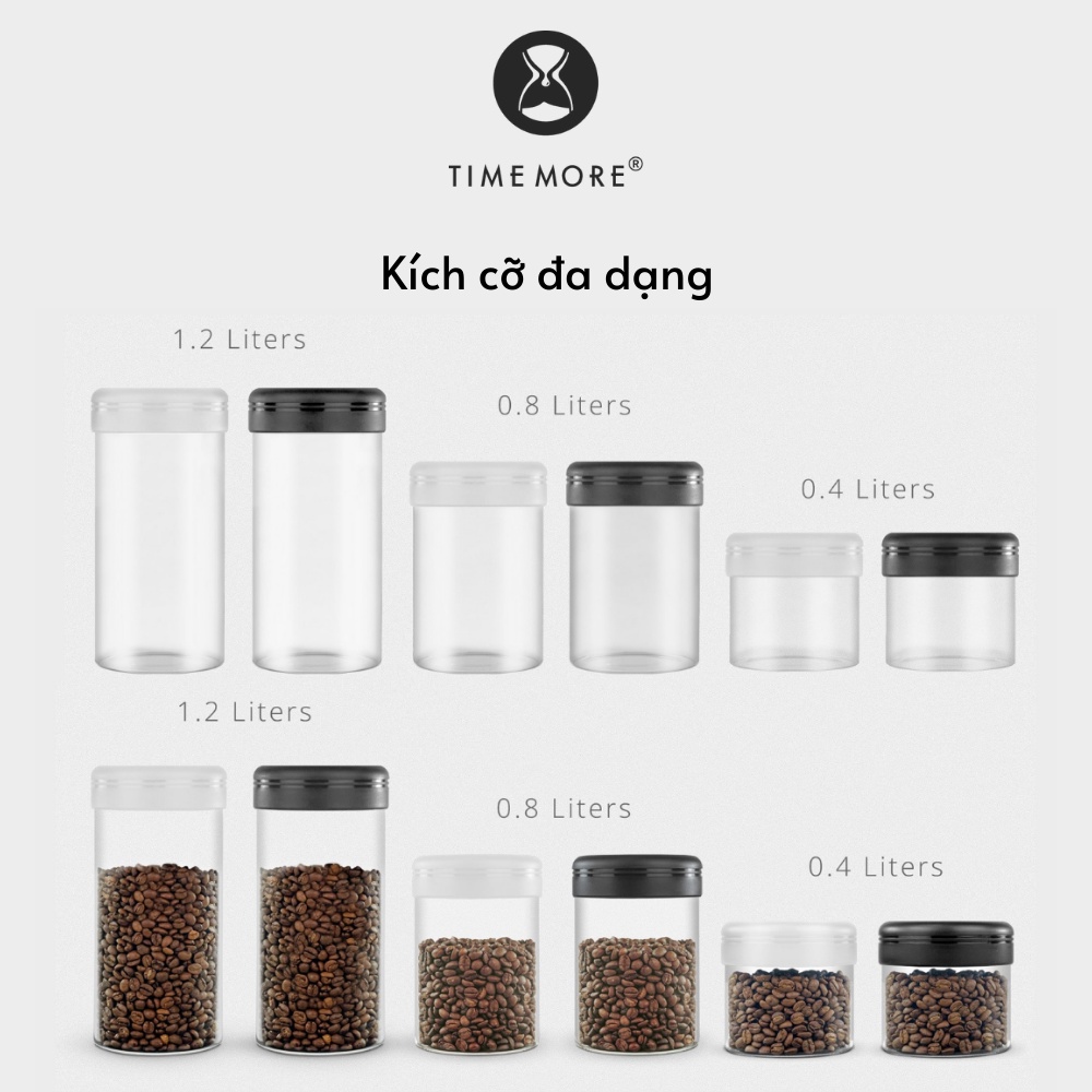 BÌNH BẢO QUẢN CÀ PHÊ HÚT CHÂN KHÔNG TIMEMORE CÓ GÌ? Cho phép cà phê du hành trong môi trường chân không: Dĩ nhiên nó ko đạt tới mức chân không hoàn toàn. Nắp bình có 2 lớp silicone hạn chế tối đa ôxi chui ngược vào trong – thủ phạm chính gây lão hoá hương vị cà phê. Tăng cường thời gian bảo quản cà phê: Có thể dùng song song với việc bảo quản bình trong tủ lạnh để hiệu quả cao hơn Nút hút và xả khí tích hợp trên nắp: Chỉ 1 vài thao tác nhấn nhả là bạn đã có thể hút gần hết không khí trong bình. Bạn sẽ không thể mở được nắp bình trừ khi nhấn nút xả khí. THÔNG TIN KỸ THUẬT BÌNH BẢO QUẢN CÀ PHÊ TIMEMORE 800ML Mã sản phẩm: TVC35SS Kích thước: 800ml - D100 x H152; 400ml D100 x H100 Dung tích: 400 ~50g hạt /800ml – tương đương khoảng 350g hạt cà phê Chất liệu: Thủy tinh chịu nhiệt, silicone, nhựa Trọng lượng: 250g Design by Timemore – Made in China