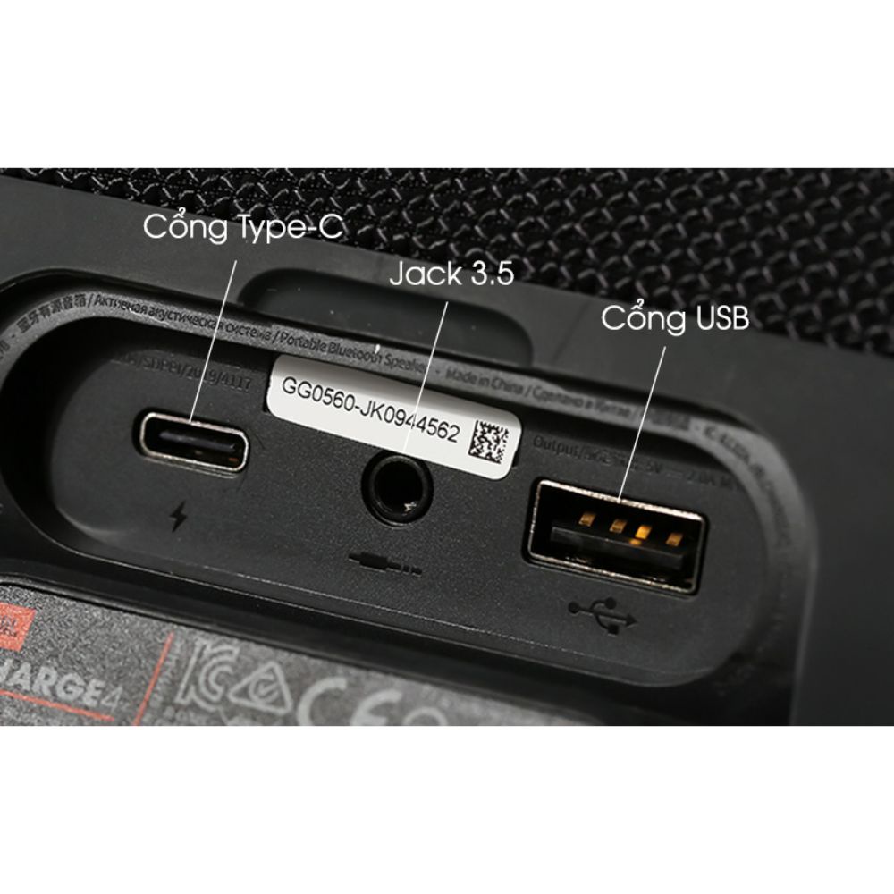 ✅ THÔNG SỐ CHI TIẾT Loa bluetooth JBL charge 4 chính hãng : - Công suất tối đa: 30W - Tần số: 60Hz-20kHz - Hỗ trợ cổng audio: 3.5mm - Dung lượng lên đến: 7500mAh - Công nghệ Bluetooth: 4.2 - Công nghệ âm thanh: JBL Connect+ - Chuẩn chống nước IPX7 - Trọng lượng: 965gr - Kích thước: 220 x 95 x 93mm - Dung lượng Pin lên đến: 7500mAh - Thời gian sử dụng: Dùng khoảng 20 tiếng - Thời gian sạc: Sạc khoảng 4 tiếng