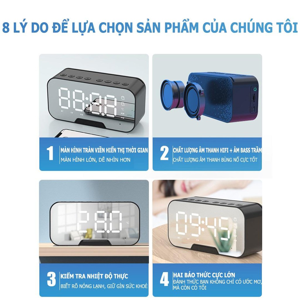 Loa bluetooth không dây mini pin trâu clock speaker D88 mặt kính tráng gương đồng hồ báo thức nghe đài FM đo nhiệt độ