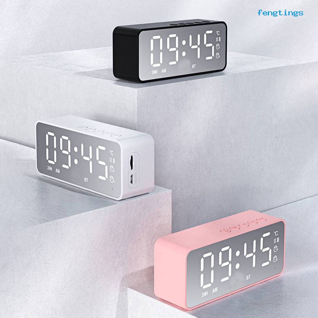 Description: Fast transmission and stable connection signal of the Bluetooth-compatible speaker are supported by the Bluetooth-compatible 5.0 version. This Bluetooth-compatible speaker supports TF card playback to meet your different playing needs. Made of ABS material, the speaker is durable and reliable to use. You will be attracted by its fine workmanship, simple and elegant design. It can provide you with a music feast with strong magnetic high-definition speakers. It is not only a Bluetooth-compatible speaker but also an alarm clock. The alarm clock can wake you up and do not miss important things. Length of the wireless speaker is 11.8cm, width is 4.8cm and height is 3.5cm. It is suitable for home, office, travel, dormitory, etc. The display screen adopts mirror surface design so it can show the time but also can be used as a mirror for making up. It also supports FM radio so that you can enjoy current affairs news, humorous jokes, etc to kill your afternoon time. It has built-in high-capacity battery to ensure the long standby time and it supports real-time battery display.
