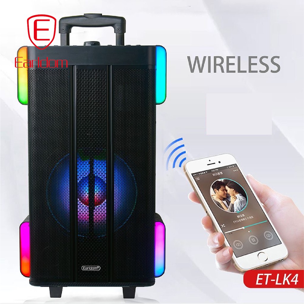 THÔNG TIN SẢN PHẨM Loa Kéo Di Động Earldom ET-LK4 ( Kèm 2 Mic Không Dây) - Thiết kế bánh xe và phần tay kéo giúp bạn di chuyển dễ dàng - Vẻ ngoài ấn tượng: Với dải đèn LED đa màu sắc tự động chạy theo giai điệu của bài hát tạo lên điểm nhấn cho chiếc loa - Công nghệ kết nối không dây Bluetooth V5.0 cho tốc độ truyền tải âm thanh nhanh chóng và ổn định - Hỗ trợ các cổng kết nối: thẻ nhớ SD, 2 cổng USB, 5 cổng AUX, 1 cổng cắm Guitar và 1 cổng cắm Mic có dây - Chức năng: Hát karoke, nghe nhạc, hỗ trợ phát nhạc khi chơi Guitar - Chất lượng âm thanh: Âm thanh siêu đỉnh cho bạn thỏa sức nghe nhạc và hát karaoke với bạn bè và người thân - Đi kèm với loa kéo là 2 Mic không dây giúp bạn hát karaoke tiện lợi