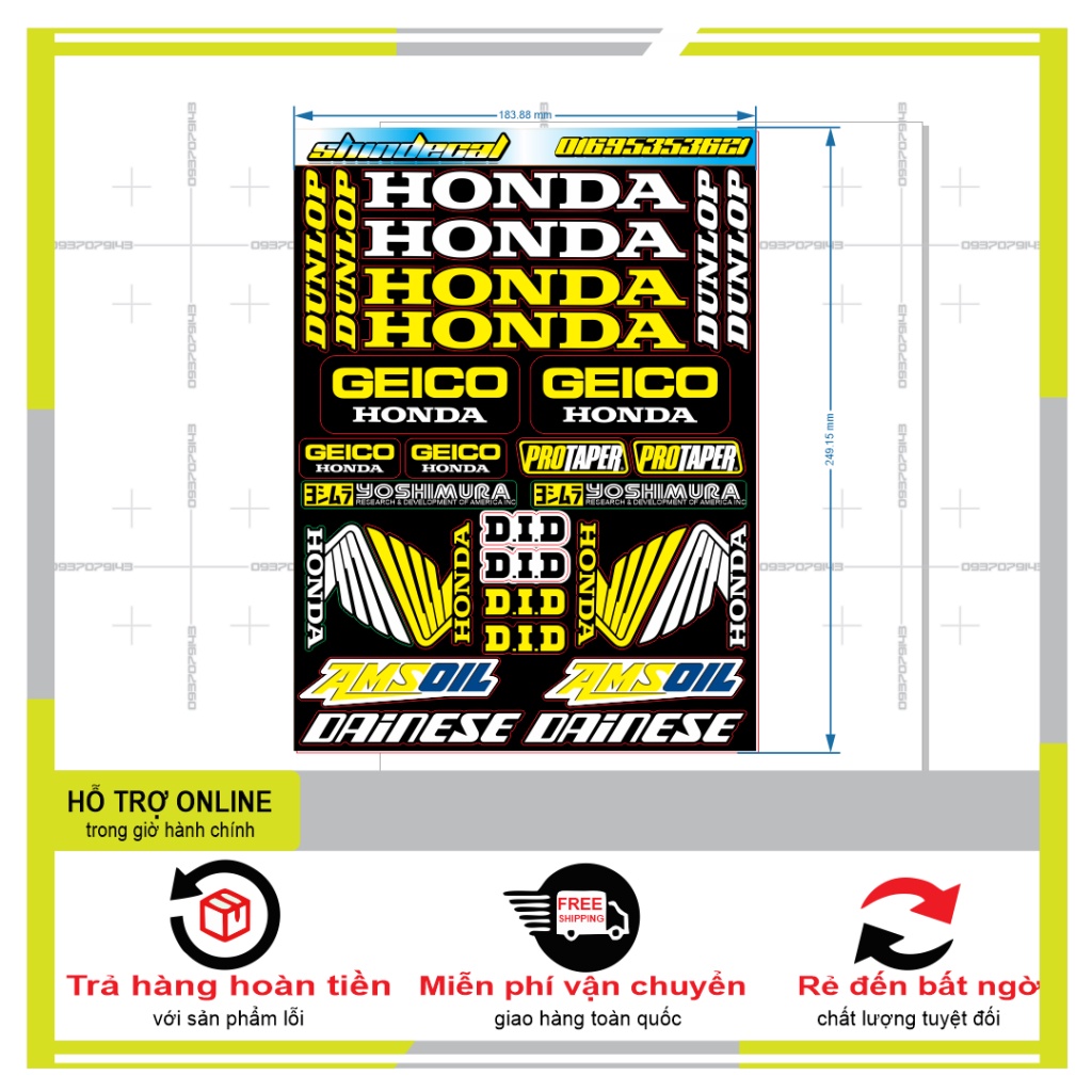 THÔNG TIN SẢN 1 bộ đủ dán 1 xe Chất liệu: Decal cao cấp Đặc tính: Tem dán cao cấp, CHỐNG NƯỚC siêu tốt, sản phẩm sáng bóng cực bền với họa tiết đặc sắc Công dụng: Trang trí. Bảo hành trọn đời KHÔNG bay màu Trọng lượng: 400g HƯỚNG DẪN SỬ DỤNG: 1/ Chùi, lau, làm sạch bề mặt dán 2/ Tách lớp tráng của keo dính và dán vào bề mặt của sản phẩm 3/ Tách lớp tráng của keo dính ở mặt đối diện còn lại và dán vào bề mặt muốn dán 4/ Sử dụng máy sấy tóc để tăng độ bám dính và giữ độ dính của sản phẩm lâu hơn 5/ Khi dán bóc đâu dán đó (miết từ từ từng ít một ) 6/ Dùng máy khò để có thể tăng độ co dãn và bám dính của Tem 7/ Tuyệt đối không được sử dụng nhiệt hoặc lửa khi dán decal CROM VÀ DECAL 7 MÀU. 8/ Sẽ có những sai số do kích thước ko chuẩn như zin được, nên xin quý khách thông cảm cho những sai số * Thời gian vận chuyển tới tay khách hàng : + Nội thành TPHCM : từ1-2 ngày (tính kể từ ngày shiper nhận hàng) + Khu vực miền Nam : từ 3-4 ngày. (tính kể từ ngày shiper nhận hàng) + Khu vực miền Trung : từ 4-5 ngày. (tính kể từ ngày shiper nhận hàng) + Các tỉnh miền Bắc : Từ 4-6 ngày. (tính kể từ ngày shiper nhận hàng)