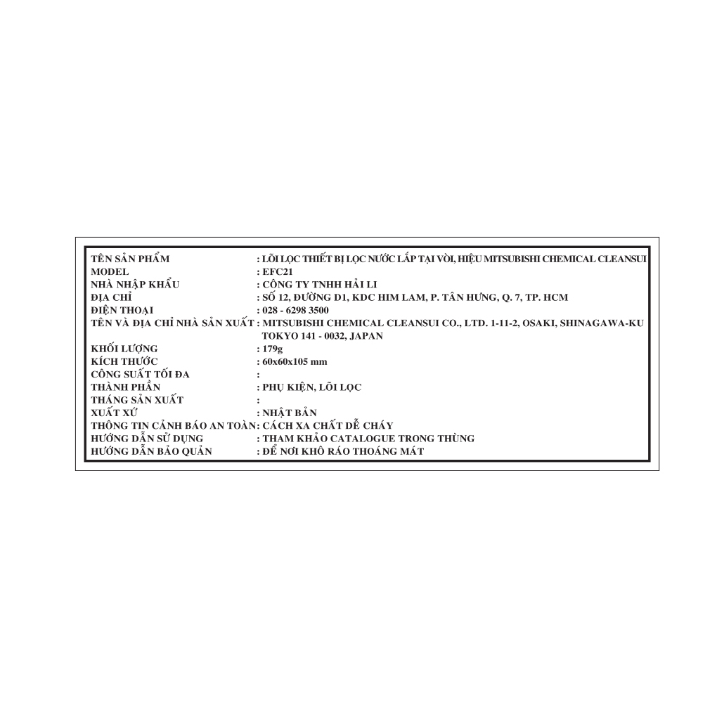 Đặc điểm nổi bật Thích hợp dùng cho thiết bị lọc nước không điện Mitsubishi Cleansui dòng EF201, có thể lọc được kích thước từ 0.1 đến 0.01 micron. Nguồn nước sạch khi trải qua 4 cấp lọc là lớp vải lưới không dệt, lớp gốm sứ đặc biệt, lớp than hoạt tính, lớp màng lọc sợi rỗng. Cấp lọc 1 - Lớp vải lưới không dệt: Loại bỏ được các cặn bẩn, tạp chất trong nước. Cấp lọc 2 - Lớp gốm sứ đặc biệt: Loại bỏ được chì hòa tan trong nước. Cấp lọc 3 - Lớp than hoạt tính: Khử mùi nấm mốc, Clo thừa, loại bỏ tạp chất độc hại, thuốc thực vật. Cấp lọc 4 - Lớp màng lọc sợi rỗng: Lọc được những tạp chất cỡ lớn hơn 0.1 micron, ví dụ như rỉ sét, vi sinh vật, vi khuẩn, độ đục, tảo, nấm mốc, kim loại trong nước, bảo toàn được khoáng chất tự nhiên cho nước sau lọc. Lõi lọc nước Mitsubishi Cleansui thiết kế đơn giản, tiện thay mới, cho thời gian sử dụng 3 tháng (tương đương khả năng lọc khoảng 200 lít nước). Đến từ thương hiệu Mitsubishi Cleansui - Nhật Bản, sản xuất tại Nhật Bản.