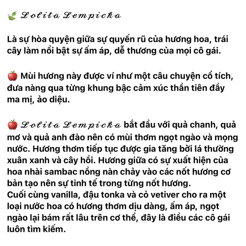 Sản phẩm LOLITA LEMPICKA • Eau de Parfum - 10ML Nước Hoa Chính Hãng đang có giá bán là 250,000đ. Hiện tại, đang có hàng sẵn tại shop của chúng tôi trên sàn TMĐT Shopee. Quý khách có thể ĐẾN NƠI BÁN để vào shop chúng tôi đặt mua online, trả góp, ship hỏa tốc, thanh toán thẻ visa/master, thông tin xuất hóa đơn đỏ (VAT) hay cần có thêm nhiều thông tin về sản phẩm.