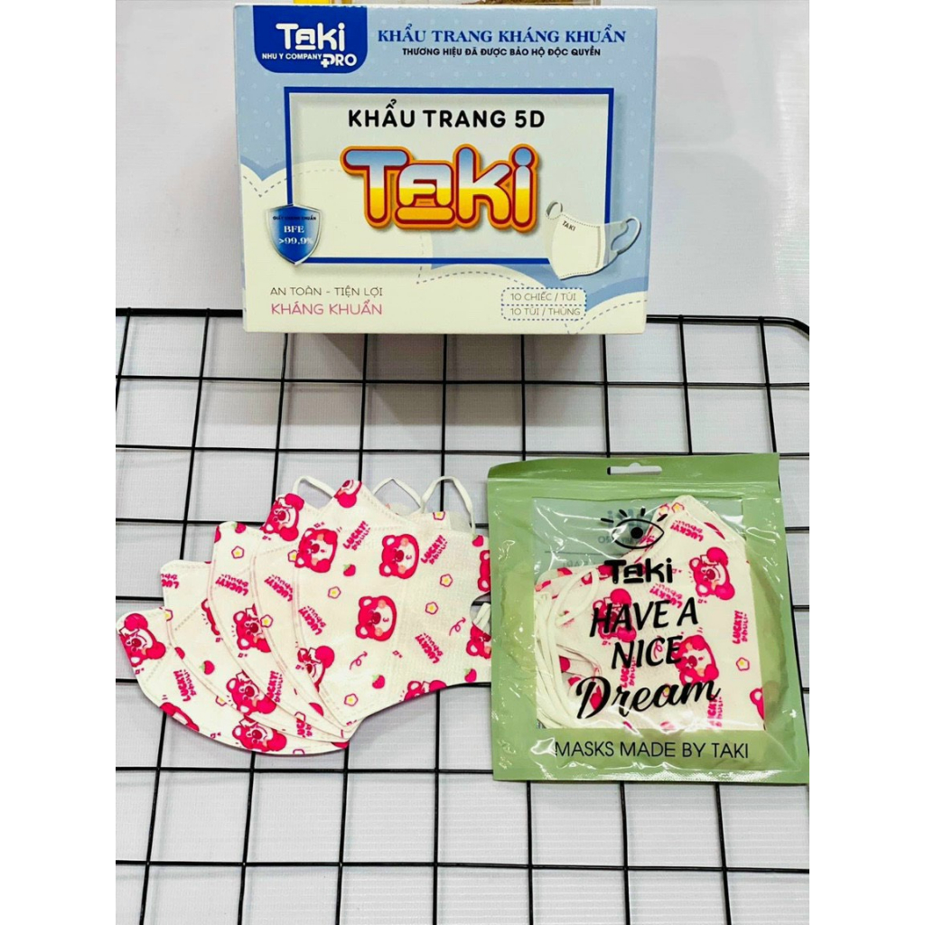 [Người lớn] 20 Chiếc Khẩu Trang Y Tế 5D Người Lớn Hãng Taki Vải Lụa, Nhiều Hình Dễ Thương ------------------------- Khẩu Trang 5D Taki Vải Y Tế Kháng Khuẩn Dày 3 Lớp Lọc Mịn 2.5PM Công Ty Taki Sản Xuất Cty SX: Công ty THƯƠNG MẠI VÀ SẢN XUẤT NHƯ Ý ĐC SX: Xuân Lai - Gia Bình - Bắc Ninh Hạn Sử dụng : 3 Năm kể từ ngày Sản Xuất. Hạn Sản Xuất: In trên Bao Bì Sản Phẩm. Quy cách đóng gói: 10 cái / Túi 1 Túi sản xuất 1 Hình, ví dụ 50 túi là 5 hình nếu khách muốn mua mix nha. để đảm bảo an toàn vệ sinh cho bé shop không tách lẻ từng túi khẩu trang để mix hình ạ. Mong khách thông cảm nha <3 Thành phần cấu tạo khẩu trang: Thun đeo tai mềm , vải spunlace, vải không dệt SMS và SS kháng nước , lọc mịn. Kiểu dáng 4D mang đẹp và mềm mại, hạn chế lem son. Công dụng và ưu điểm: - Ngăn ngừa bụi , vi khuẩn. - Ngăn ngừa tia UAV. - Thiết kế ôm dễ chịu đẹp mắt. Hướng Dẫn Sử Dụng: - Đặt Khẩu Trang lên mặt, Logo hướng ra ngoài - Kéo hai dây vòng qua 2 bên vành tai Sản phẩm chỉ sử dụng 1 lần (Không được giặt lại). Nên để khẩu trang ở vị trí thuận tiện gần cửa, thoáng mát. Cty SX: Công ty THƯƠNG MẠI VÀ SẢN XUẤT NHƯ Ý ĐC SX: Xuân Lai - Gia Bình - Bắc Ninh Hạn Sử dụng : 3 Năm kể từ ngày Sản Xuất. Hạn Sản Xuất: In trên Bao Bì Sản Phẩm.