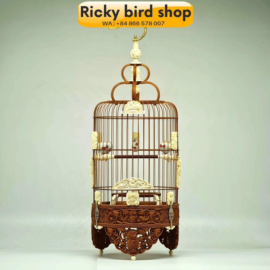 - The cage come with all bones accessories same as pictures (Buffalo bones 100%) - Bird cage made from bamboo and beautifully carved. - The cage has used oil to create color as shown.