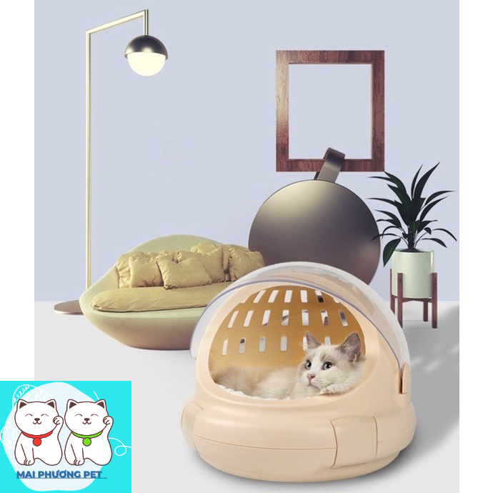 Lồng phi hành gia kết hợp ổ nệm nhựa cho chó mèo Màu Be cho chó mèo dưới 4kg đầy đủ phụ kiện