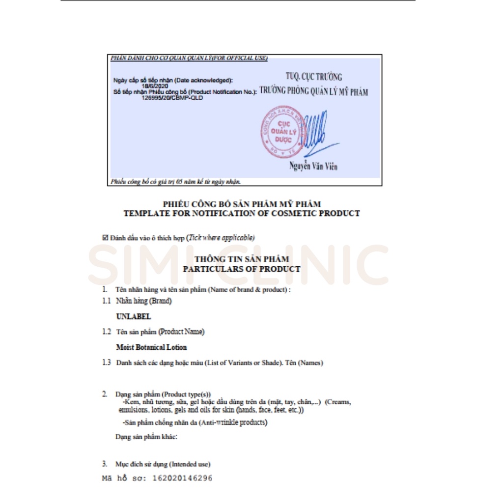 1 Thành phần của Lotion dưỡng ẩm Unlabel: Thành phần thiên nhiên chính: Cosmoperine có nguồn gốc từ hồ tiêu, Rễ Marshmallow, Cúc La Mã, Lá Xô thơm, Hạt Ý dĩ, Rễ Hoàng Cầm, Quả Yuzu, Hạt dẻ ngựa, Rau má, Rễ thược dược, Rễ Đương quy, Lá Blueberry