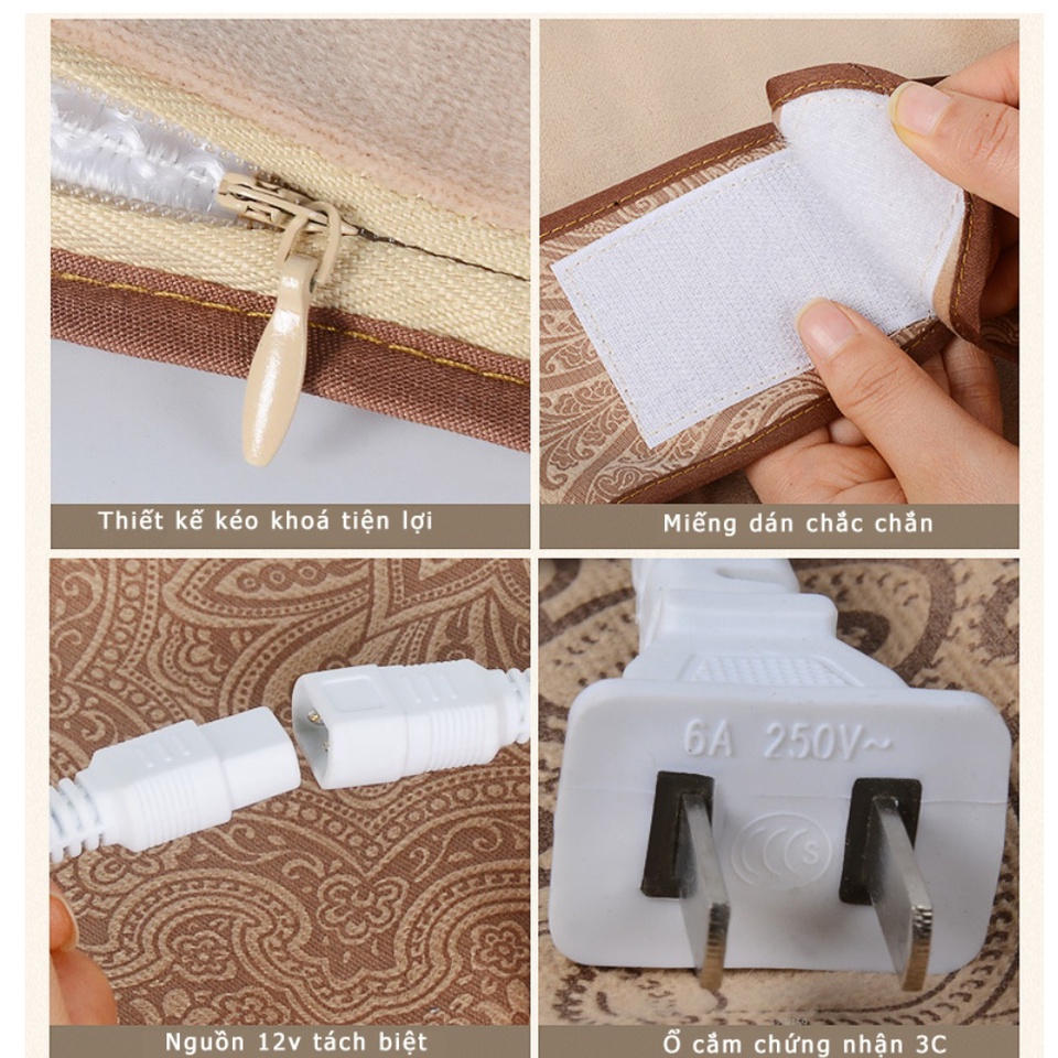 - Cấu tạo: + Ruột làm từ ngải cứu khô và các thảo dược (sả, quế, gừng khô, ích mẫu...) + Tấm đan nhiệt vi mạch gia điện làm nóng đai và thảo dược. + Tấm thảo dược thẩm thẩu qua lớp biểu bì da vào xương giúp giảm đau và lành nhanh thoát vị đĩa đệm , gai cột sống + Vỏ: vải cotton mềm mại, hoa văn sang trọng + Nút vặn điều khiển độ nóng và hẹn giờ (9 mức độ nóng và 2 mức hẹn giờ)