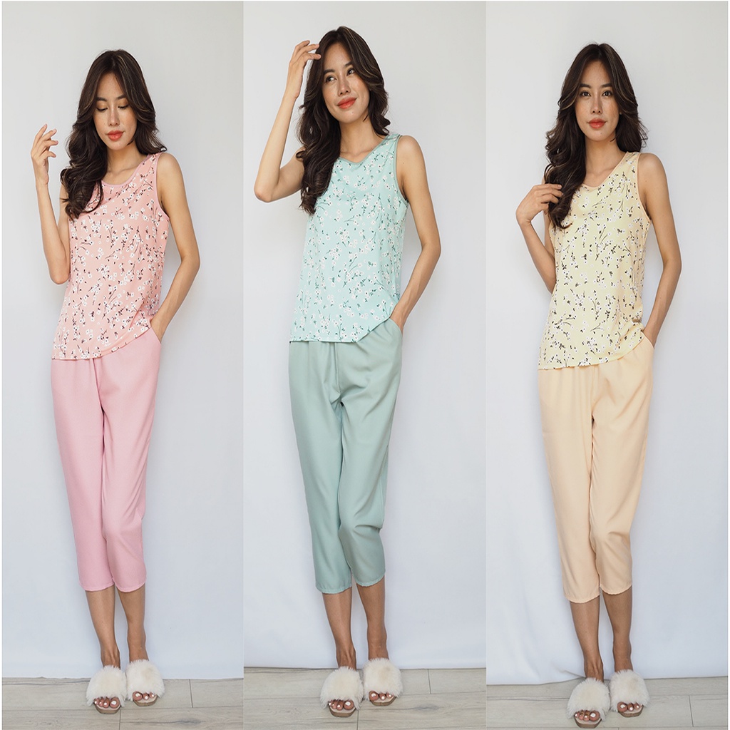 Giới thiệu Đồ bộ đồ lửng mặc nhà lụa thái áo sát nách hoa nhí sang mịn xin size 40-70kg